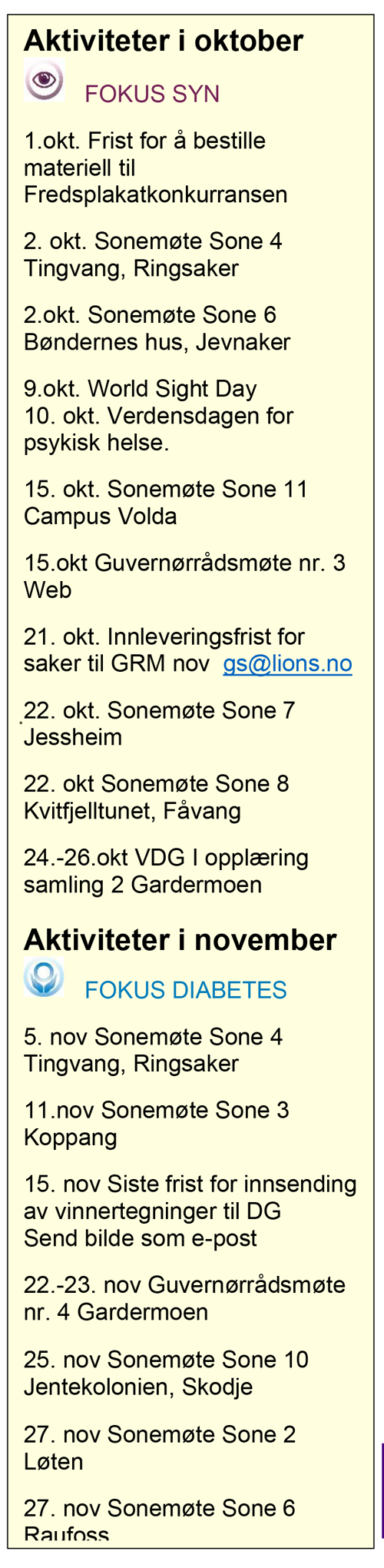 Vi vet at det finnes mange mennesker der ute som ønsker å bidra frivillig, men som ikke nødvendigvis kjenner til Lions. Jeg oppfordrer deg fortsatt til å Invitere positive ressurspersoner til medlemsmøte i oktober eller november. En uformell prat kan være starten på et nytt Lions-eventyr. Vi trenger som kjent flere hender.