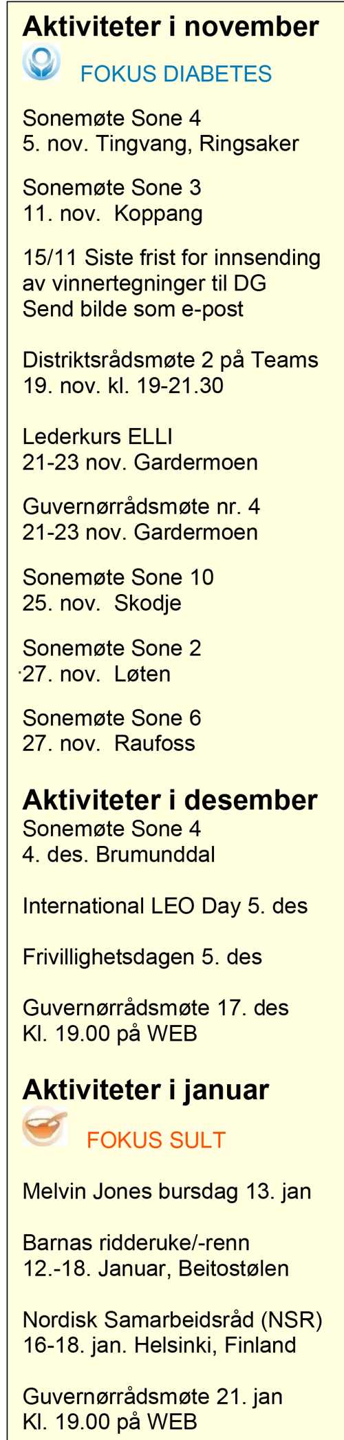 Jeg har hatt gleden av å delta på flere klubbesøk og sonemøter i høst, og jeg er imponert over alt det gode arbeidet som legges ned rundt om i distriktet. Det er både lærerikt og motiverende å møte så mange engasjerte medlemmer, og ikke minst å utveksle erfaringer mellom klubbene.