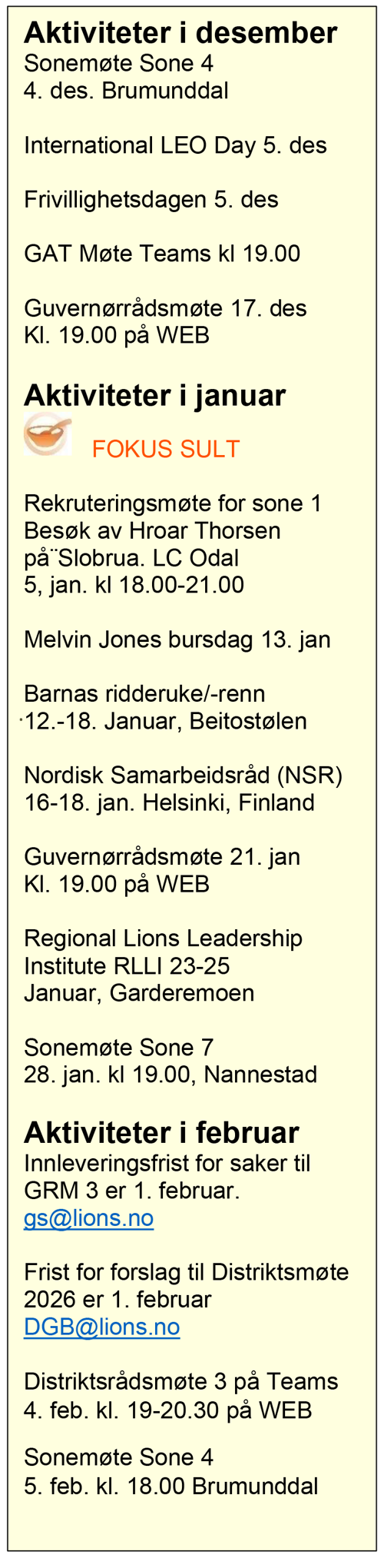 Desember minner oss om verdien av å møtes og gjøre ting sammen. I Lions betyr ofte desembermøte julebord med ledsagere. La oss fortsette å ta godt vare på hverandre og skape gode øyeblikk i klubbene våre. Små handlinger kan gjøre stor forskjell.