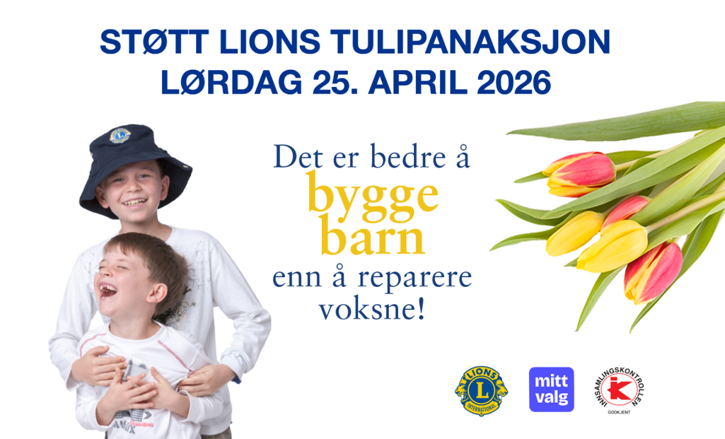 25 april er det igjen klart for "vårens vakreste eventyr" - Lions Tulipanaksjon. Du finner Lionsmedlemmer ved kjøpesentre, butikker og andre møtesteder over hele distriktet. Oppfordringen er: Støtt vårt arbeide med barn og unge!